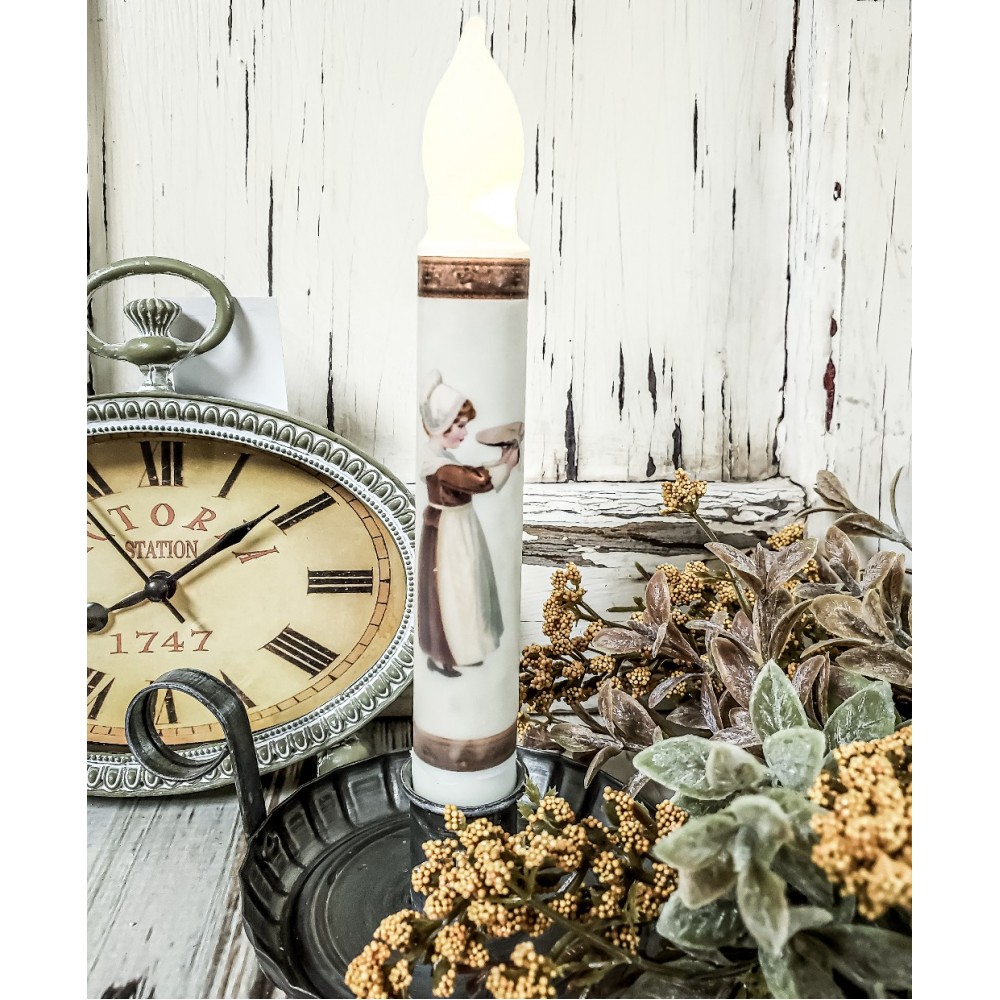Vintage Postcard Inspired Thanksgiving Pilgrim Girl Handmade Flameless Timer Taper Candle