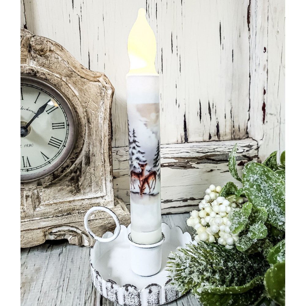 Charm and functionality come together with this beautiful handmade timer taper candle. Made with a beautiful vintage inspired image, you are sure to fall in love with this always popular candle. It has a beautiful white flickering glow. Approx. 6.25" high.