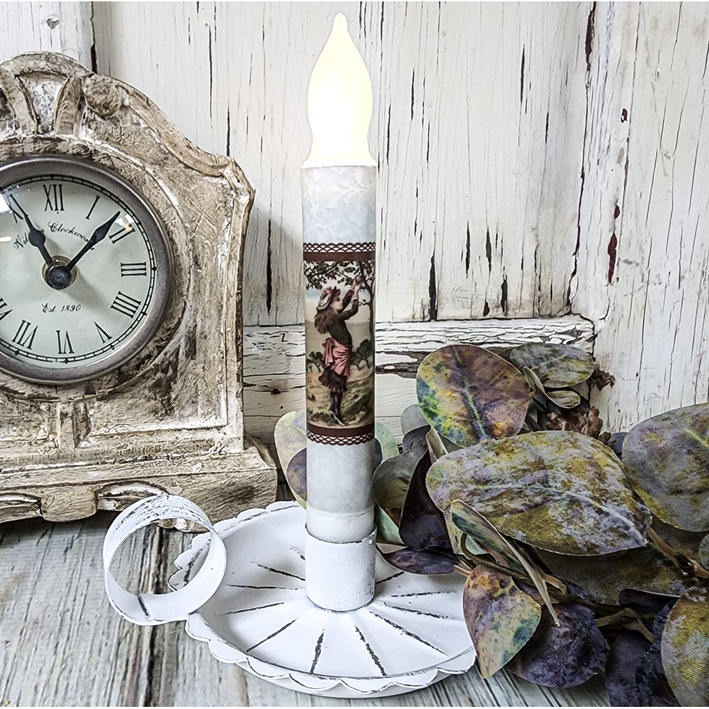 Vintage Inspired Girl Picking Apples Cottagecore Timer Taper Candle