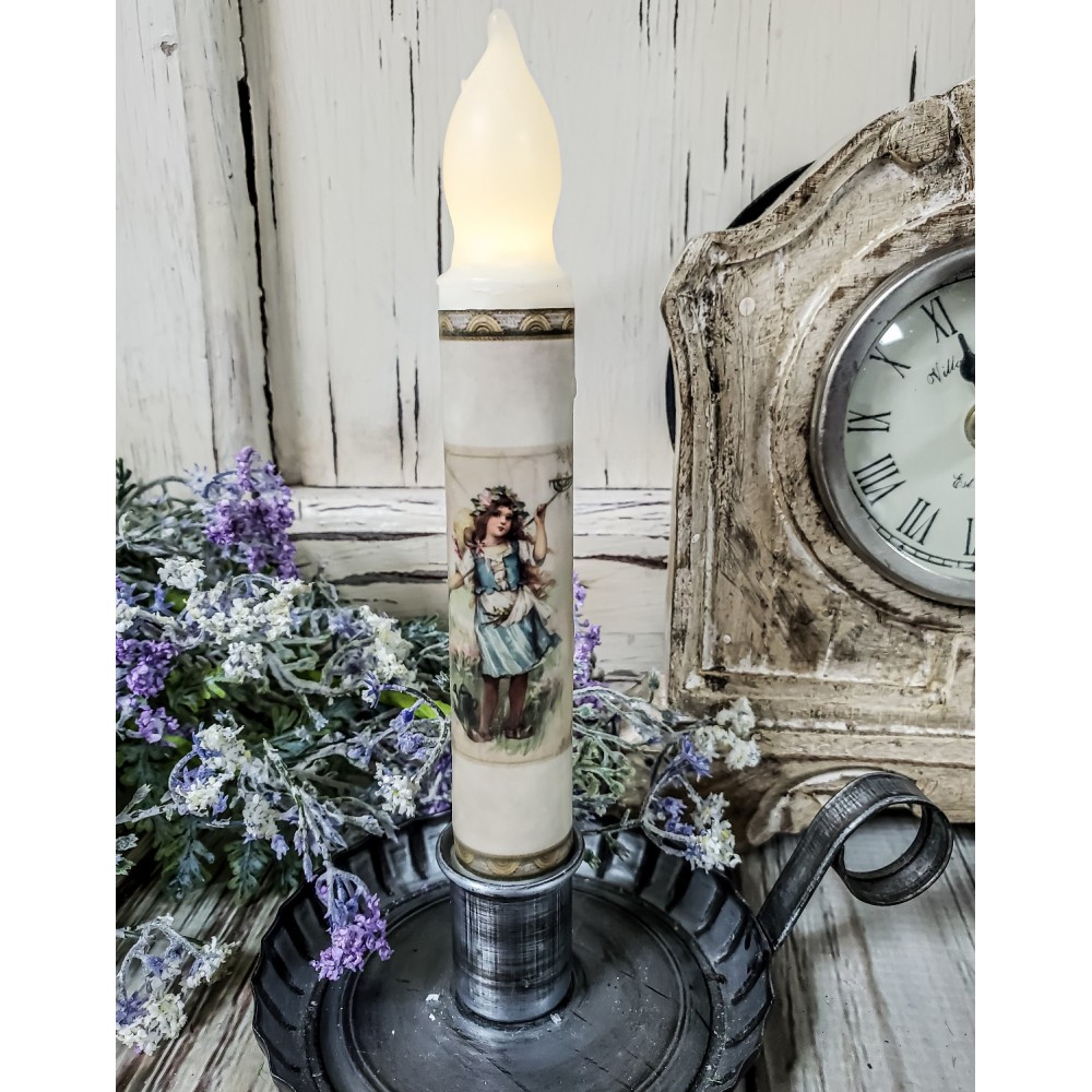 Charm and functionality come together with this lovely unique handmade timer taper candle. This candle features a beautiful Vintage image of a sweet little girl working in the meadow...just lovely for your home this Summer, you are sure to fall in love with it. It is approx. 6.5" high to the tip of the "flame".
