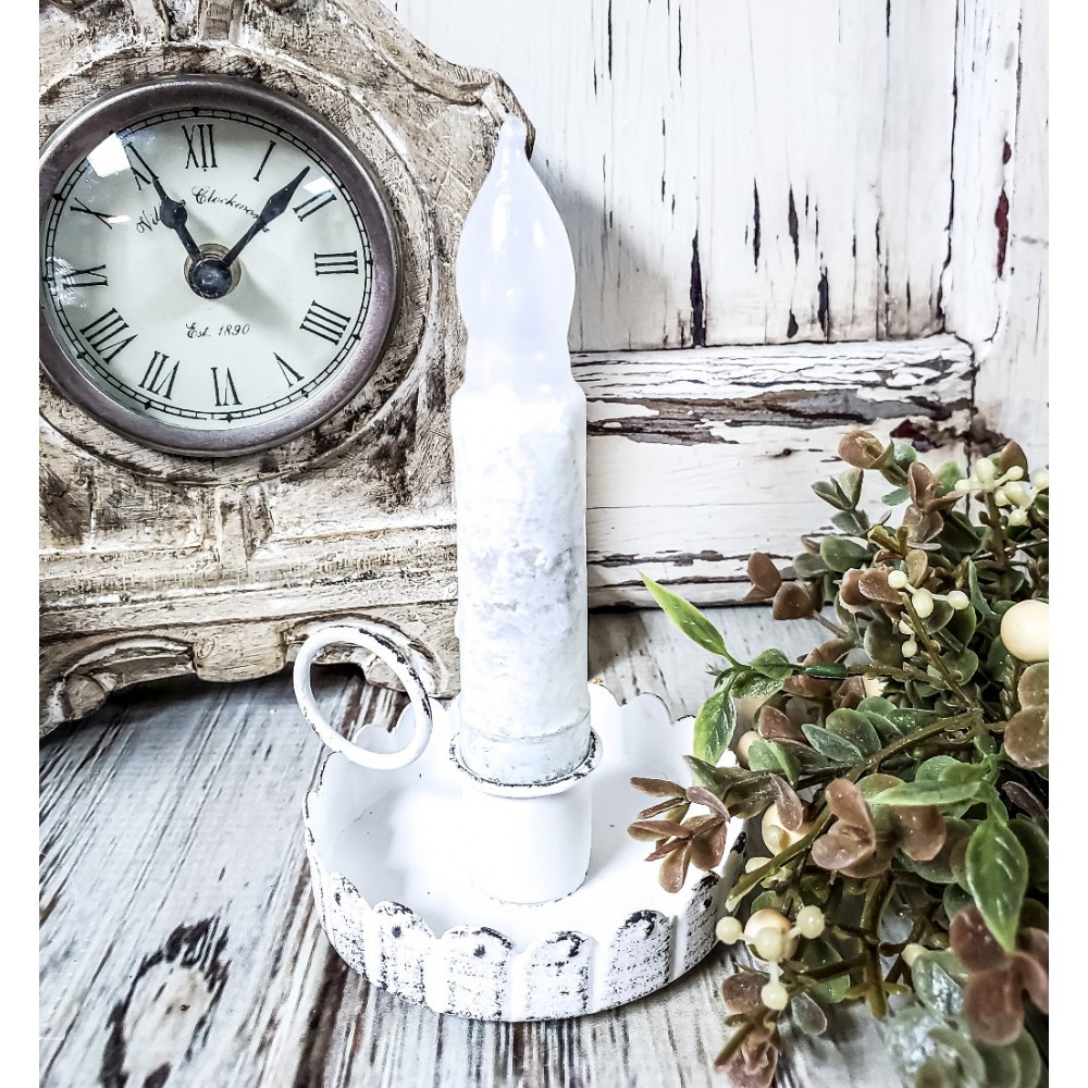 This painted metal taper holder has distressed white finish, fluted candle pan, and a round loop handle for carrying. This candle holder looks great on shelves, counters, and side tables and it complements a variety of taper colors. It is approx 3.25" wide with the handle included.