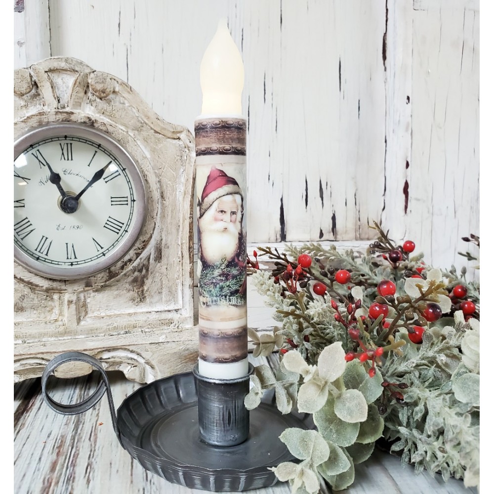 Charm and functionality come together with this beautiful handmade timer taper candle. Made with a beautiful vintage inspired image, you are sure to fall in love with this always popular candle. It has a beautiful white flickering glow. Approx. 6.25" high.