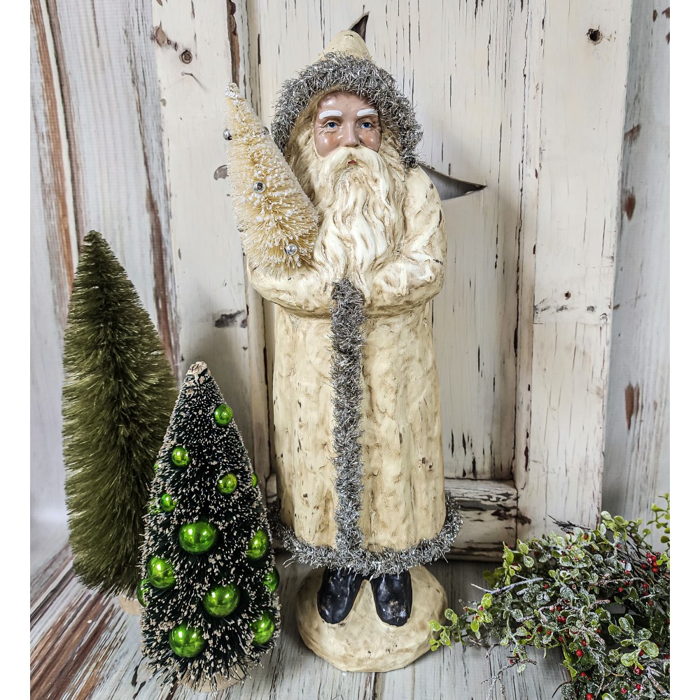 This darling large Belsnickel is sure to add Old World charm to your home this Holiday season. Made of Resin with Silver Tinsel accents and a bottle brush tree...so much charm He is approx. 17" tall.